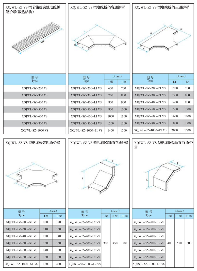 XQJWL-SZ VS 型節能耐腐蝕電纜橋架護罩(散熱結構)、 XQJWL-SZ VS 型電纜橋架彎通護罩、 XQJWL-SZ VS 型電纜橋架三通護罩、 XQJWL-SZ VS 型電纜橋架四通護罩、 XQJWL-SZ VS 型電纜橋架垂直上彎通護罩、 XQJWL-SZ VS 型電纜橋架垂直下彎通護罩各系列型號參數: